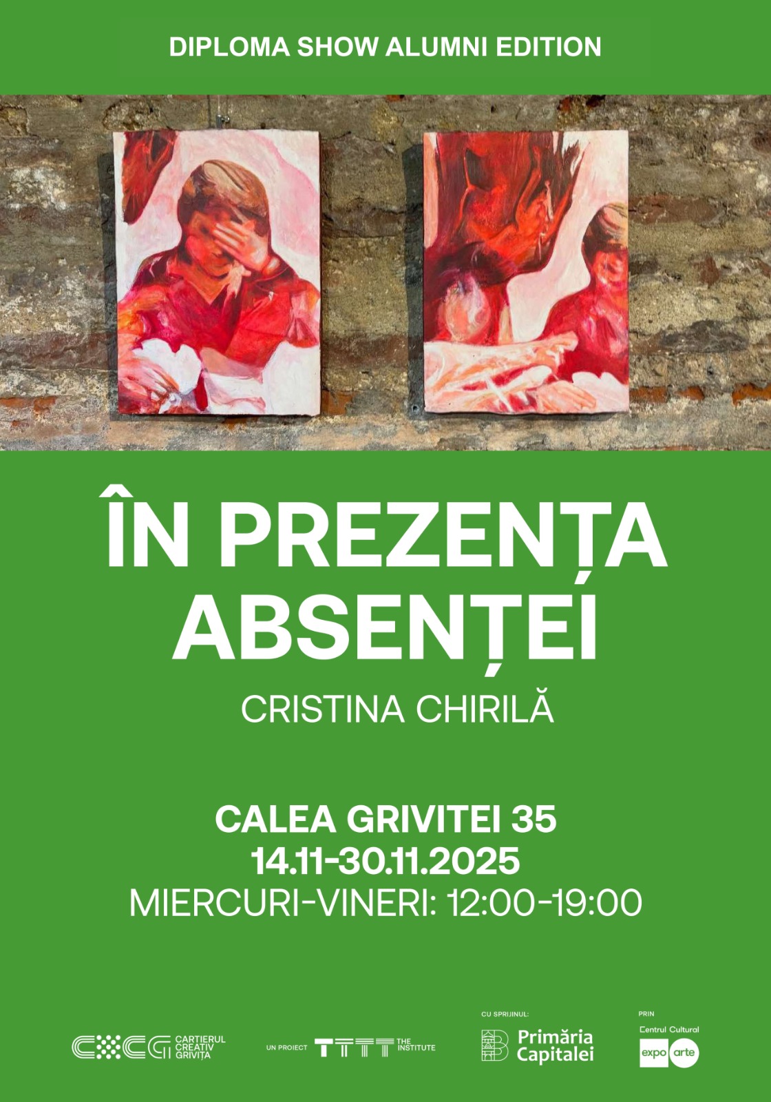 Vineri, 14 noiembrie 2026, începând cu ora 18.00 are loc vernisajul expoziției capsulă Diploma Show Alumni Edition: Cristina Chirilă – „În prezența absenței”. Expoziția explorează absența ca formă de prezență, transformând durerea în limbaj poetic prin pictură, broderie, metal și sticlă. Obiectele devin metafore vizuale pentru memorie și transformare, propunând o reflecție profundă asupra relației dintre viață, moarte și continuitate.